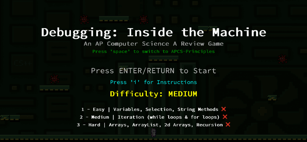 Welcome to Inside the Machine, a browser-based platformer where you dive into a glitchy computer system, dodge rogue viruses, and debug your way to safety using real AP Computer Science concepts.