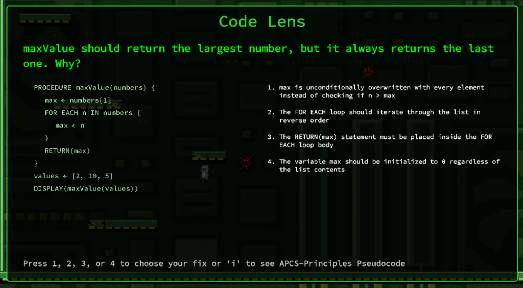 Every glitch is an opportunity to call on APCS-A Java or APCS-P pseudocode knowledge, depending on the chosen mode. - Choice of Course & Difficulty